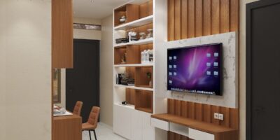 Ruang tamu bergaya minimalis ini dirancang untuk menghadirkan kenyamanan dan kesan lapang. Menggunakan palet warna netral dengan sentuhan hangat seperti